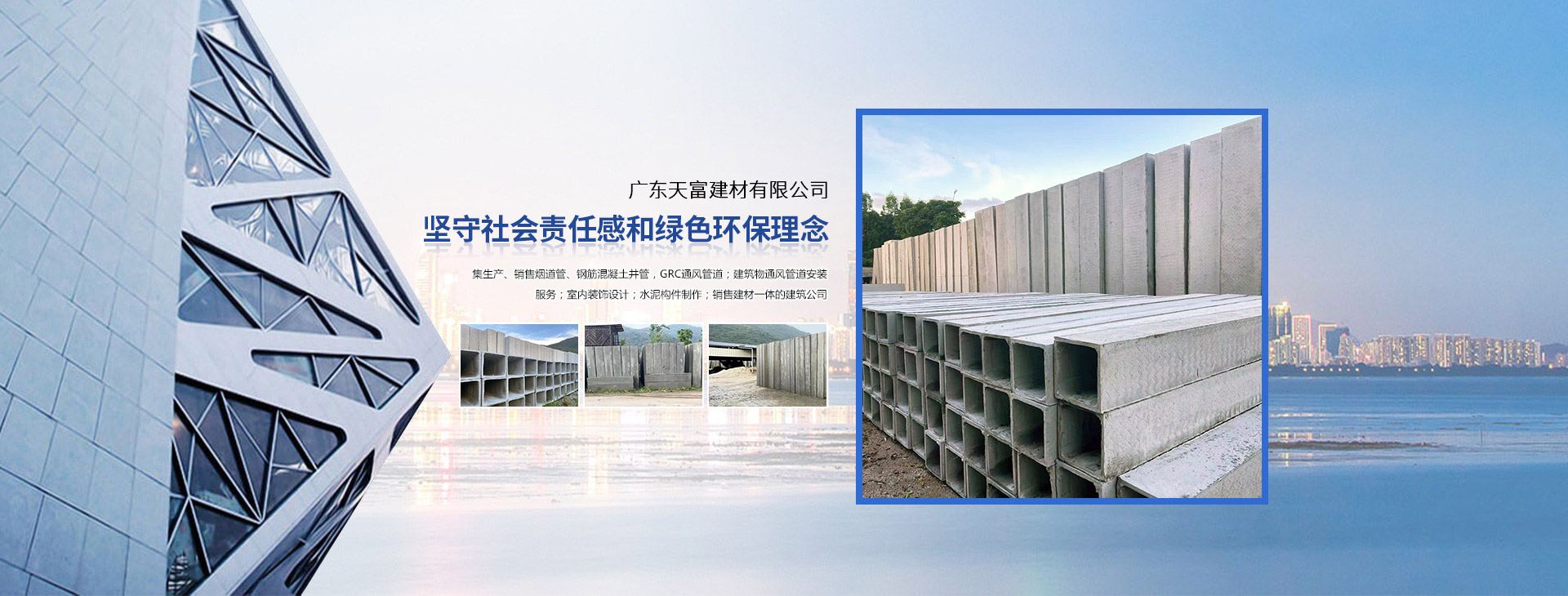 廣東天富建材有限公司是集生產、銷售煙道管、鋼筋混凝土井管、GRC通風管道,建筑物通風管道安裝服務、室內裝飾設計、水泥構件制作于一體的建筑公司。公司擁有一支高素質、高水平、年輕的團隊,秉承“品質·服務”的經營理念,為客戶提供科學經濟的方案及技術指導。